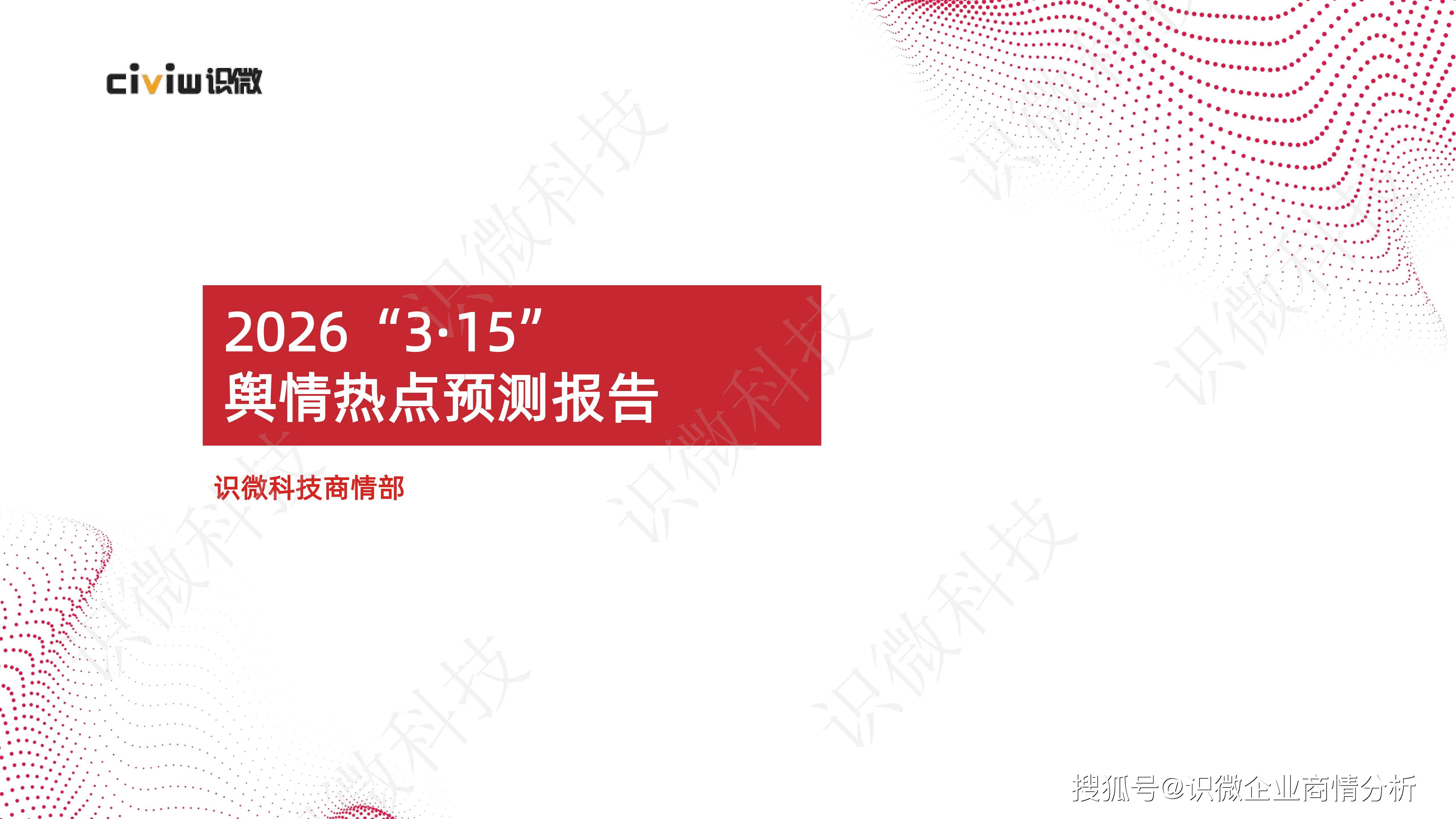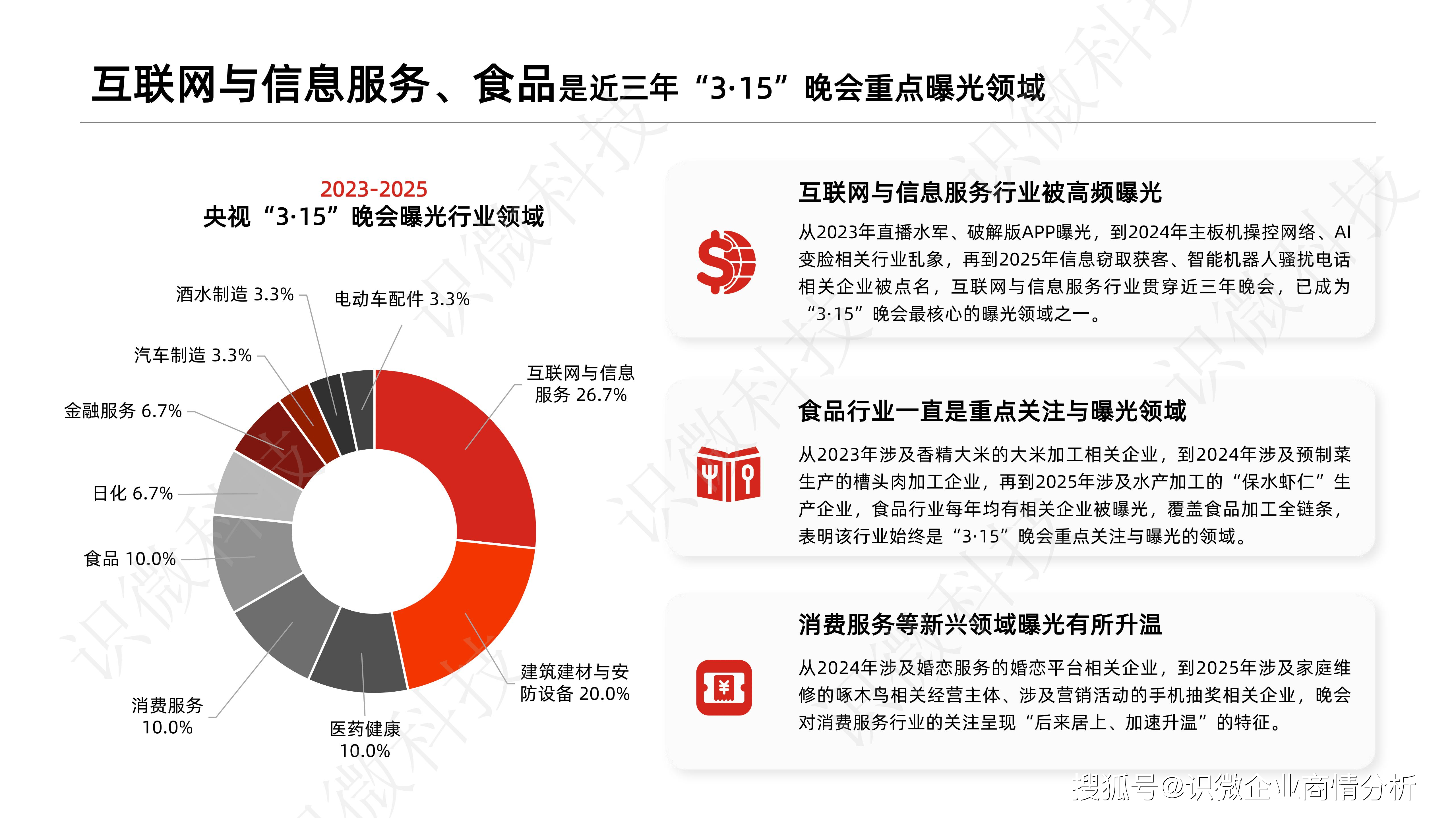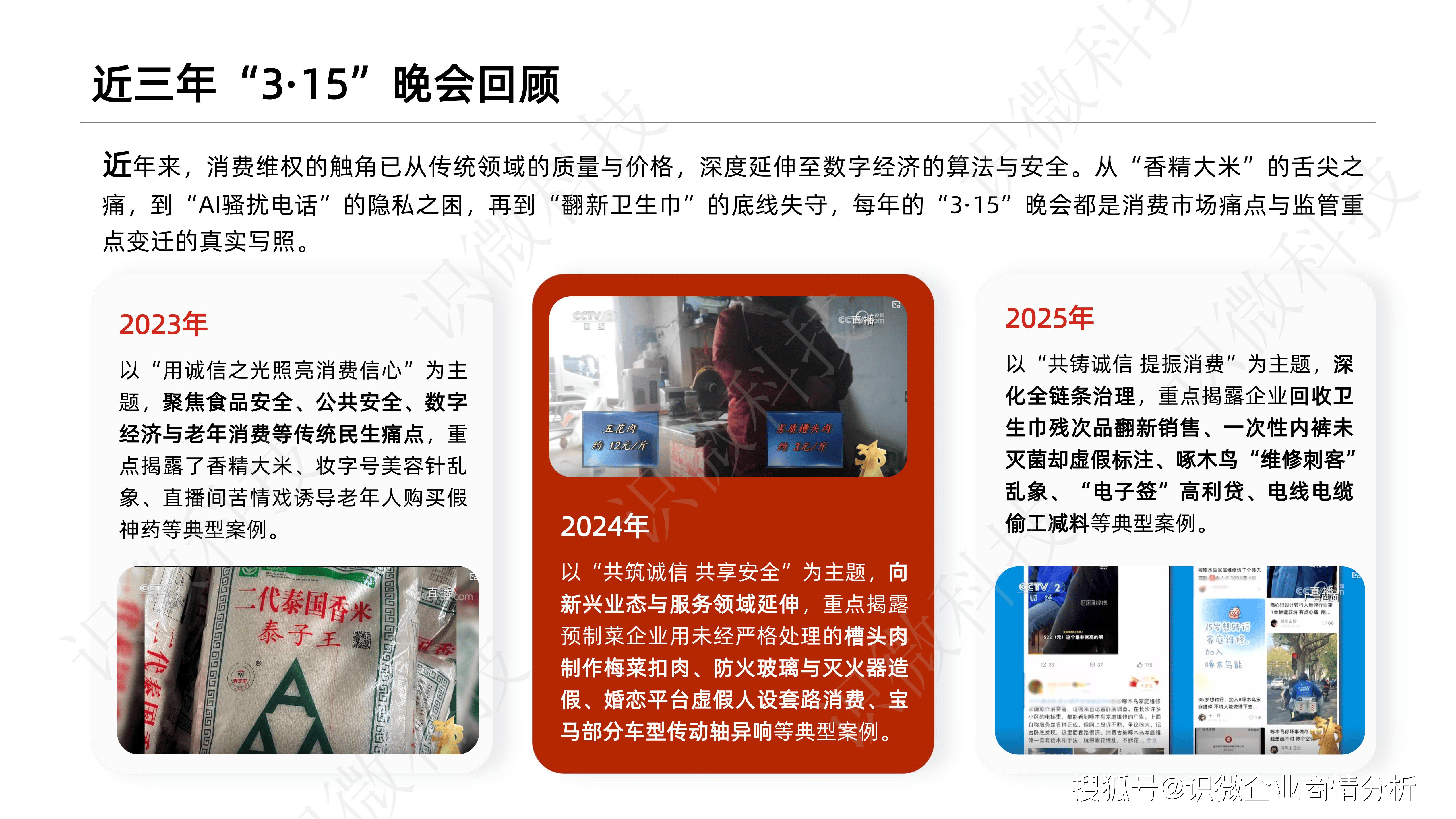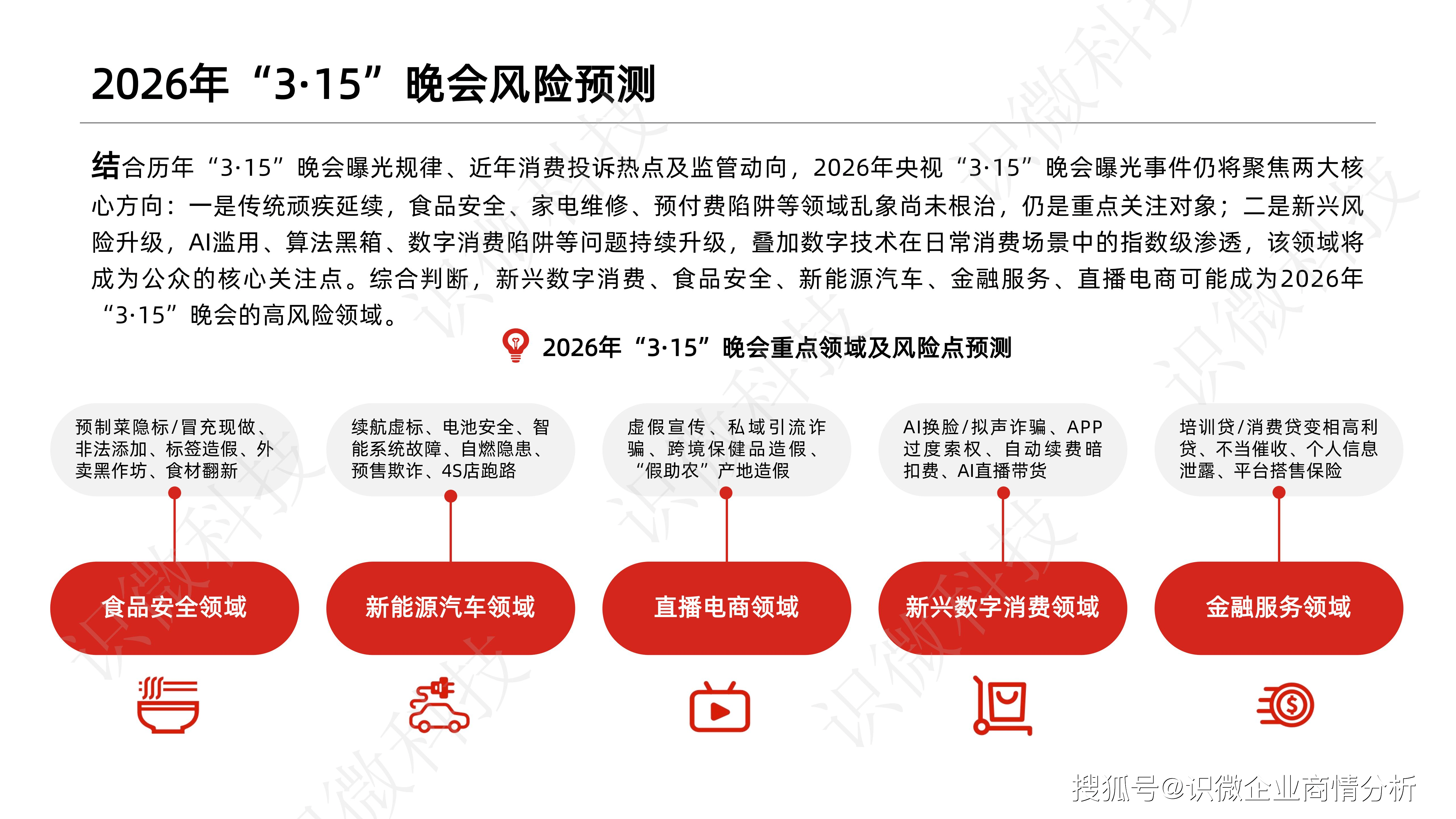 •2025年:从题共铸诚信 提振消费,○风险点:预制菜现标/假充现做、外卖黑做坊、不法添加、虚假标注、校园/团餐平安。食物、消费办事、医药健康 各10.0%;金融办事 7%。连系监管趋向预测 2026 年高风险范畴,本演讲为识微科技按照2023-2025 年 3・15 沉点,收集黑产 10%;;为企业前置风控、预警响应、黄金措置、品牌修复的全流程舆情办理供给参考。